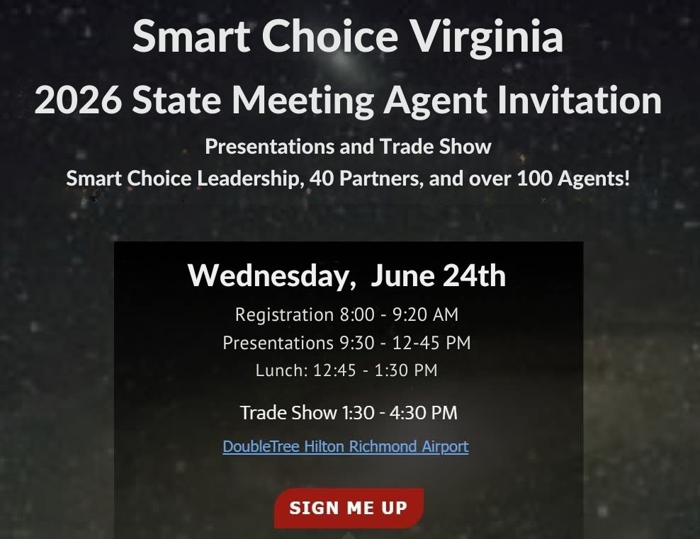 Our 2026 Smart Choice Virginia State Meeting is a few short months away. Please see the info below, REGISTER, Save the Date, and plan to attend. We have over forty carrier & vendor partners attending. With the Hard Marketing Breaking, this meeting will be most important to line up appointments and get the tech stacks setup!